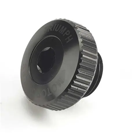 The cap features a sleek black anodised finish, providing resistance against corrosion and adding a touch of elegance to your motorcycle. Its design includes laser-etched Triumph branding and vertical knurling, facilitating easy removal and installation. Additionally, an Allen head is incorporated for convenient handling.