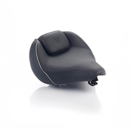 A seat designed for maximum rider comfort, featuring increased lumbar support and 3D net cushioning. Finished in black with white piping detail designed to match the standard and accessory (comfort range) pillion seat. Embroidered Triumph logo.