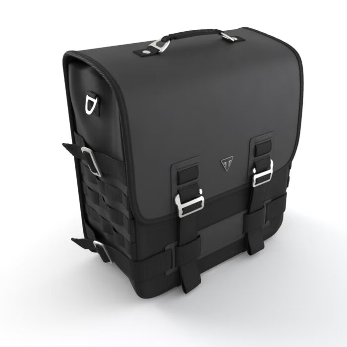 The Triumph 20-litre capacity single left-hand mounted rugged pannier is made from modern materials with contemporary, rugged styling. Includes a key lockable mounting system for extra security. Black steel mounting rail included. 5kg payload.