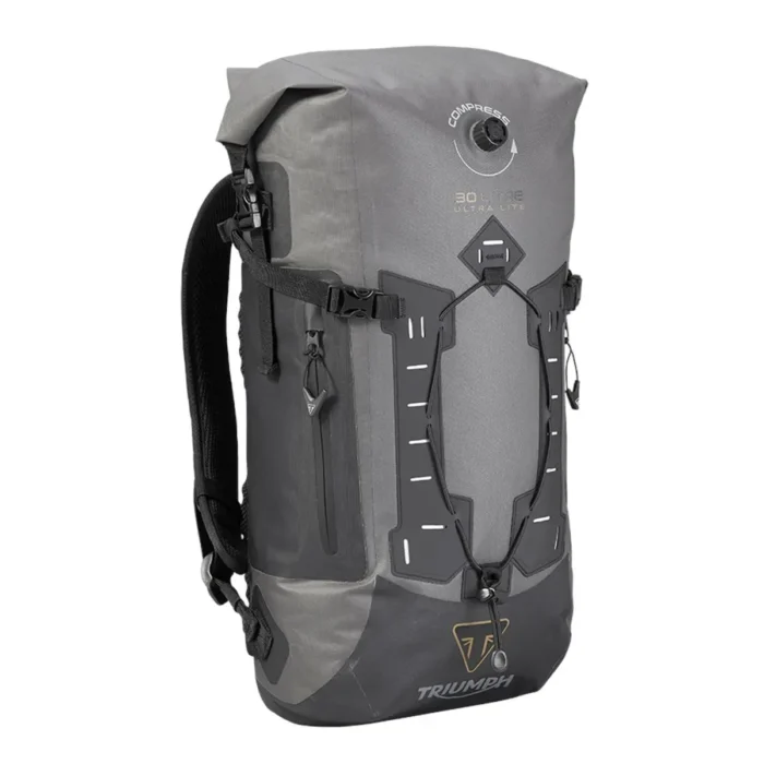 Triumph 30L Ultra Lite Tourer Bag is designed using the lightest of components in every aspect possible to reduce stress on your back and neck. Let the contents be the weight you carry not your bag in this 30L waterproof seam-sealed lightweight rucksack, perfect for a trip away in any weather. The Airflow padded system allows air movement, reducing heat and perspiration to the rider’s back. The easy access rolltop feature allows you to compress the bag with the use of the airflow valve and reduce the capacity as needed. Features an extra top pocket and robust top grab handle.