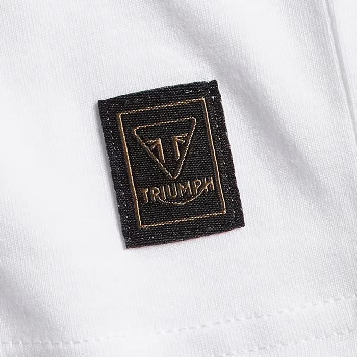 The Triumph Bamburgh Embroidered Logo White T-Shirt is a stylish and comfortable addition to any wardrobe. Made from 100% cotton and weighing 160g, it features a classic crew neck design with an embroidered Triumph logo on the front and a signature woven badge on the lower hem.