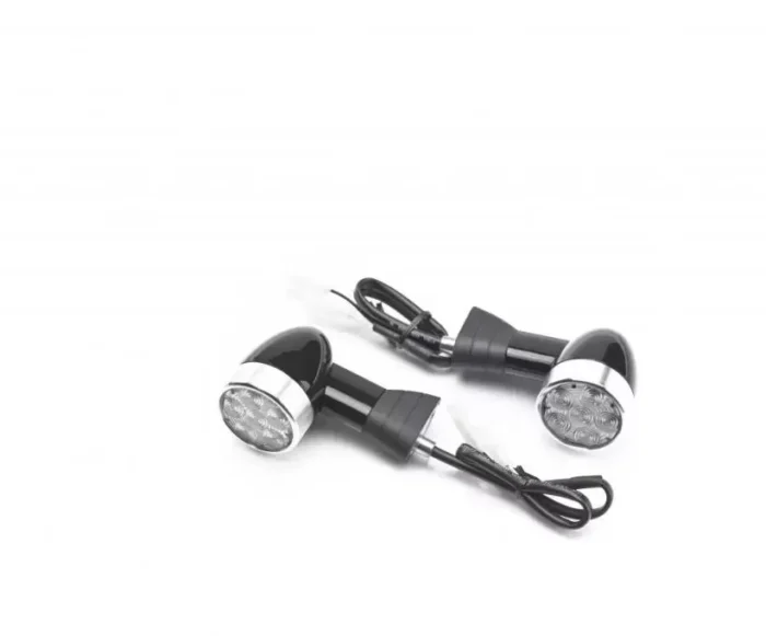 The kit features bullet-style LED indicators with a turned aluminium bezel, gloss black body, and clear LED lens. With a 40mm diameter and short stem design, these indicators provide a compact and stylish appearance that complements the classic aesthetics of your motorcycle.