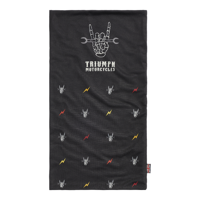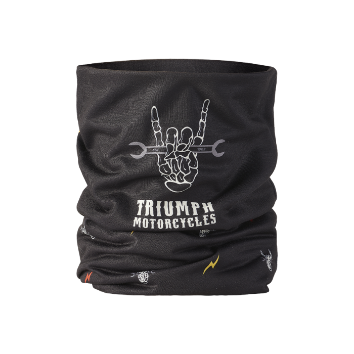 Triumph Thunder Neck Tube is constructed from two layers of soft stretch fabric. It features a skeletal hand holding a wrench with red and gold thunderbolts on the outer layer. Designed for comfort both on and off the bike, this neck tube is a stylish accessory for riders.