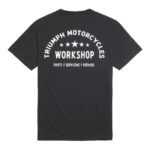 Featuring a bold Triumph logo and workshop-style graphics on the chest, this tee pays homage to the brand’s legacy while maintaining a contemporary aesthetic. The minimalist black design ensures it pairs seamlessly with jeans, riding pants, or your favorite casual outfits, making it a staple for any Triumph enthusiast.