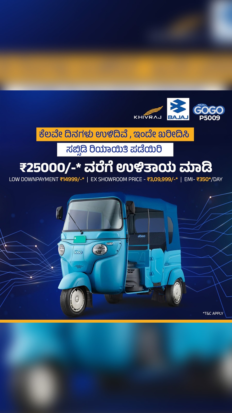 ಹೊಸ ಬಜಾಜ್ P5009 EV ಆಟೋ – ಹೆಚ್ಚು ಉಳಿತಾಯ, ಹೆಚ್ಚು ಗಳಿಕೆ! ಕೇವಲ ₹14,999 ಡೌನ್ ಪೇಮೆಂಟ್ ನಲ್ಲಿ ನಿಮ್ಮದಾಗಿಸಿಕೊಳ್ಳಿ. ಇಂದುಲೇ ಖಿವ್ರಾಜ್ ಮೋಟಾರ್ಸ್ನಲ್ಲಿ ಬುಕ್ ಮಾಡಿ! ⚡